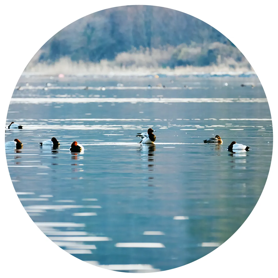特に11月~3月の気温の下がる季節には、ホオジロガモ、キンクロハジロ、オナガガモなどの野鳥が集まります。