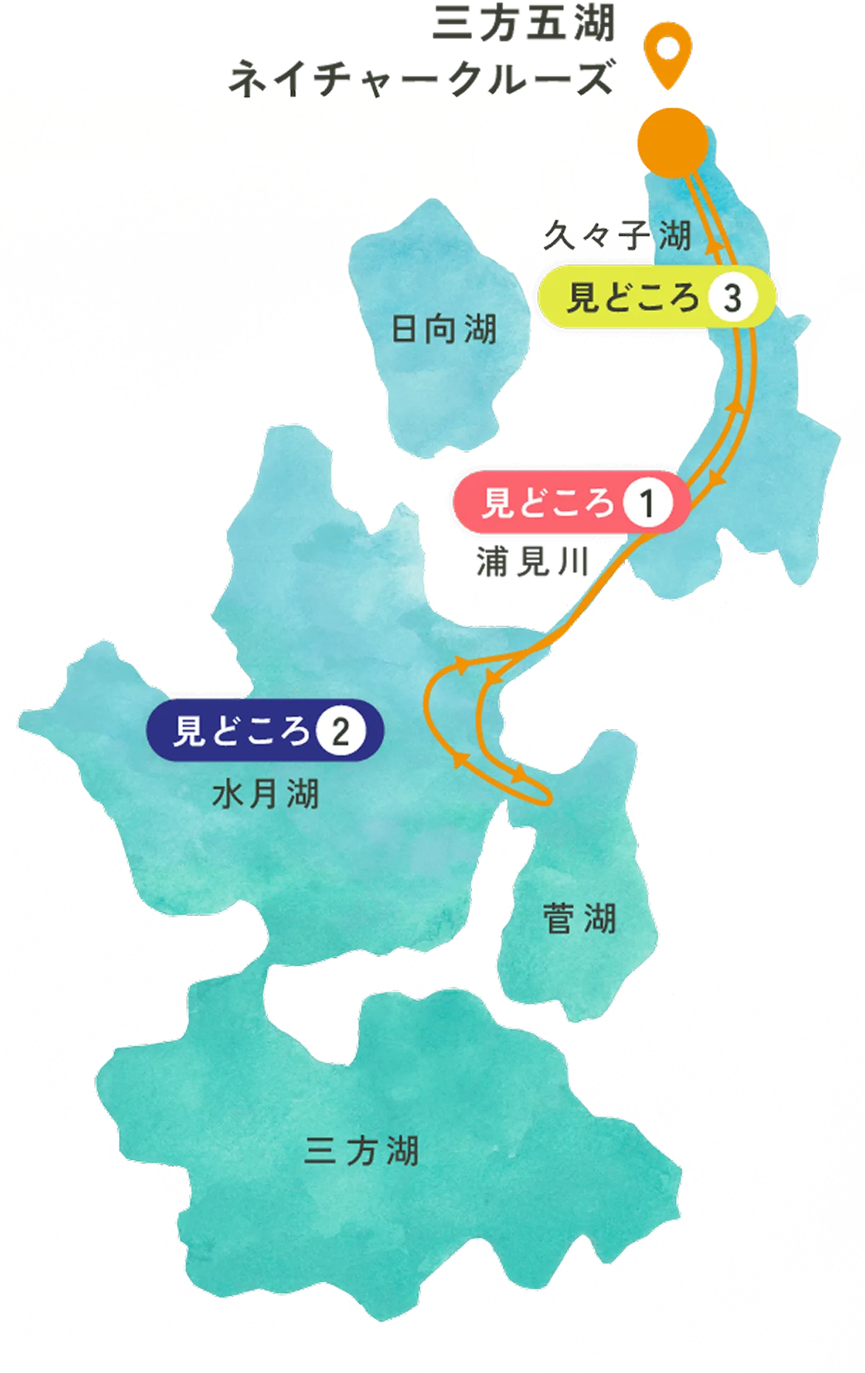 久々子湖を出発し、浦見川を通過して水月湖をめぐる約50分のコースです。