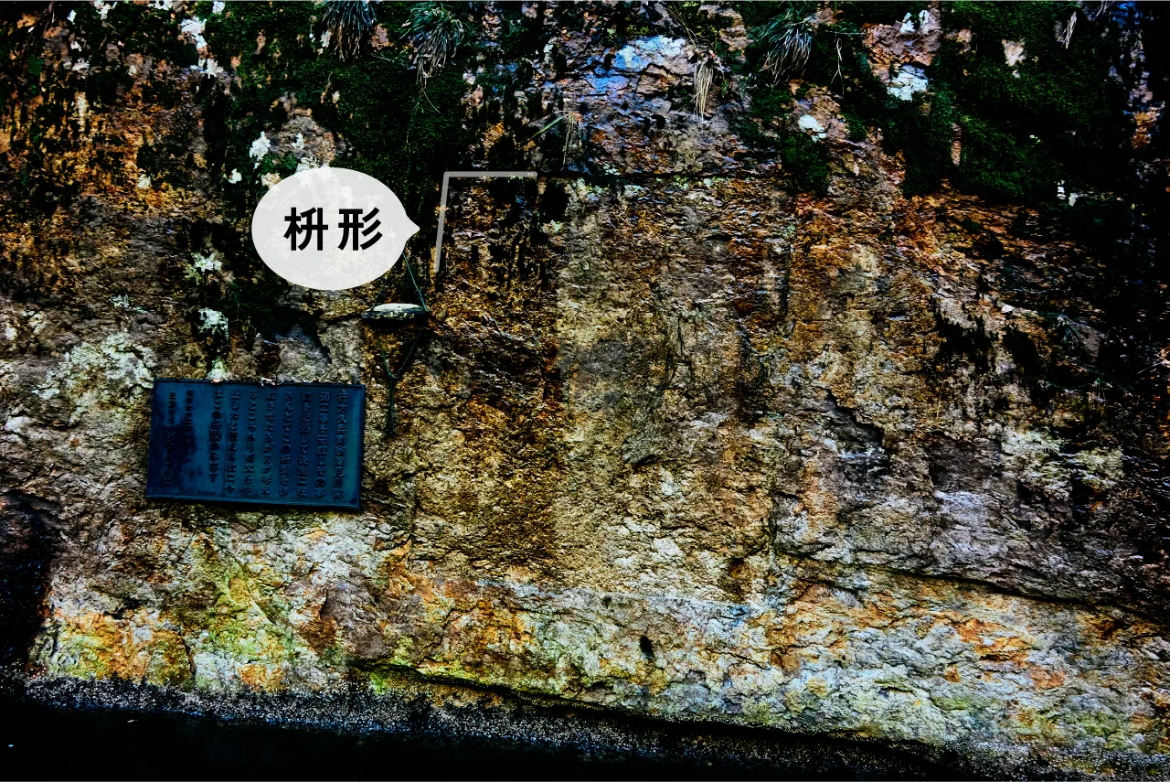 岩肌に遺された文字のない枠「枡形(ますがた)」は、開削の功労者・行方久兵衛が偉業を刻もうとした跡です。