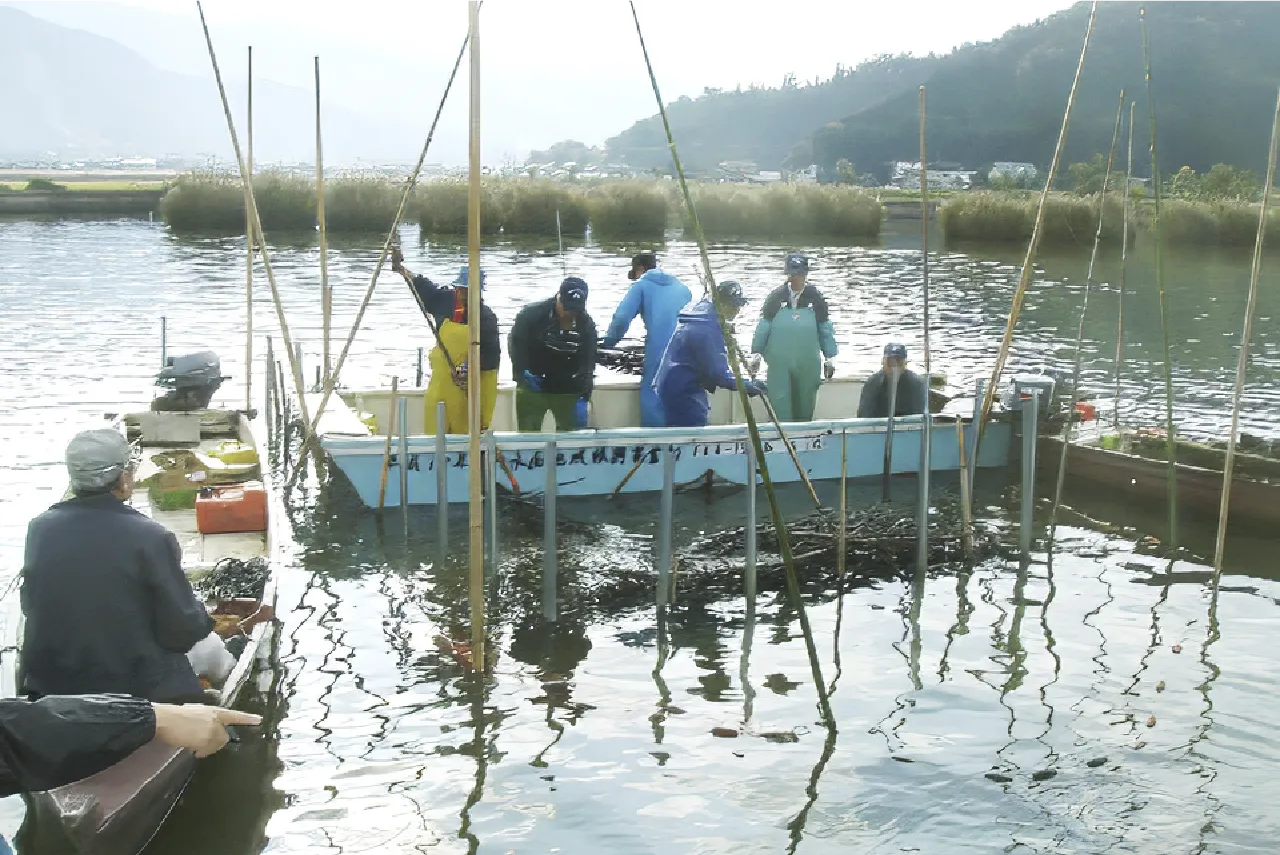 湖のあちこちに見える小さな円形の囲いは、里山で集めた木の枝を束ね、魚たちの拠り所を作ることで生まれた伝統漁法「ぬくみ漁」の跡です。「柴漬け」とも呼ばれるこの漁法は、小魚や手長エビたちが枝の間に集まる習性を利用した、自然と寄り添う知恵の漁法。今も湖の生態系を守るため、地元の漁業組合が柴を沈める活動を続けています。