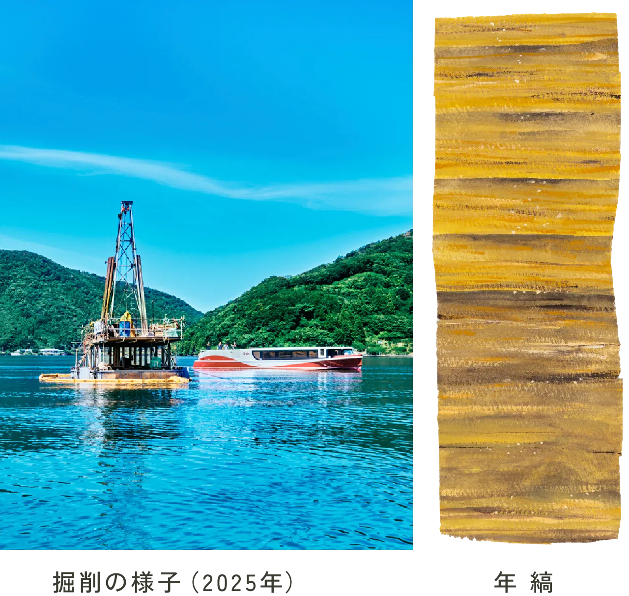 五湖のうち最も大きい水月湖は、地球全体の歴史を解き明かす「世界標準の年代ものさし」と呼ばれています。その理由は、水月湖に眠る「年縞(ねんこう)」にあります。一年に一枚(約1mm)、地底深く堆積した層が描く特徴的な縞模様は、過去7万年の環境変動や自然災害を知ることができる貴重な歴史資料です。地球の年代を正確に測る手がかりとして、世界中が注目する奇跡の湖です。