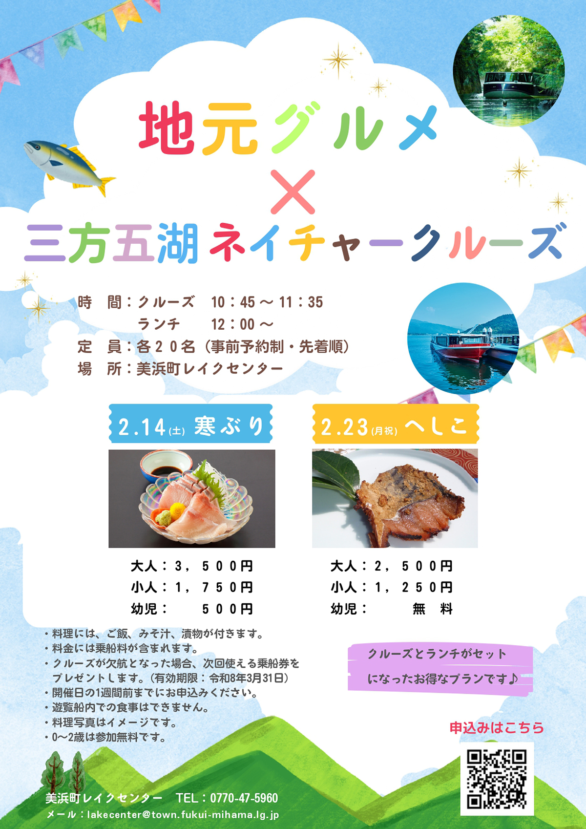 三方五湖ネイチャークルーズと、美浜ならではの地元グルメランチが一度に楽しめるお得なセットプランです。遊覧船でのクルーズのあとは、美浜町レイクセンターで旬の味覚ランチをお楽しみください。