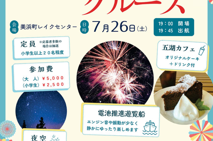 美浜町レイクセンターでは、夏の夜を彩る特別イベント「花火クルーズ」を開催します。夏フェスタ美浜2025の打ち上げ花火を、静かで快適な電池推進遊覧船のデ...