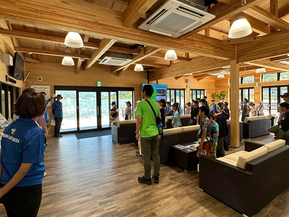 待合室にて船の構造などの説明を聞き、船内では湖に現れる野鳥「ミサゴ」に大騒ぎ!