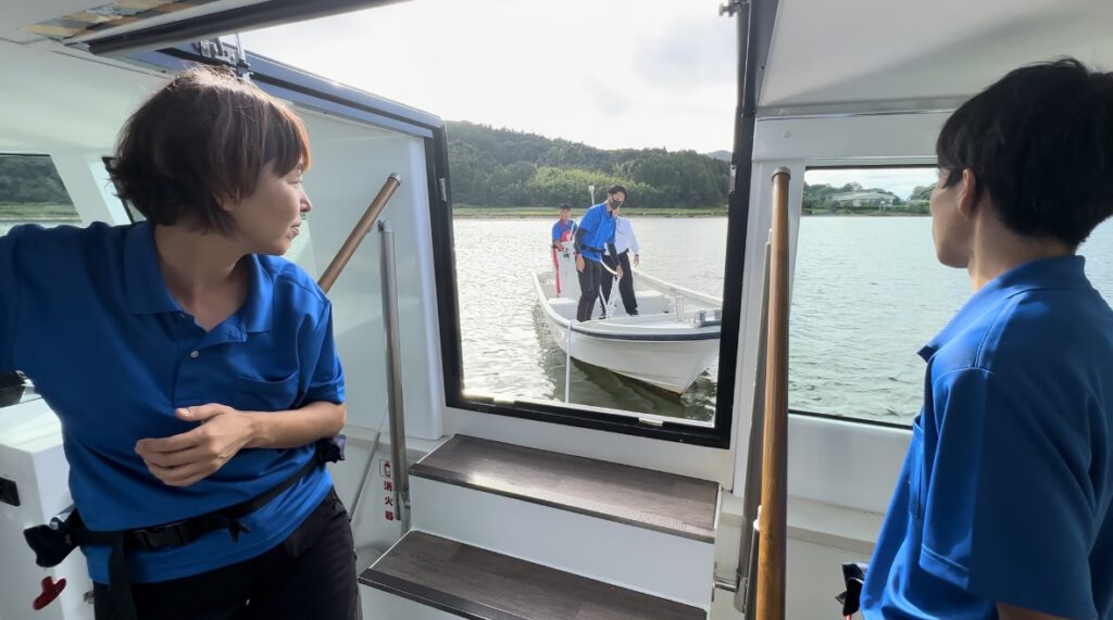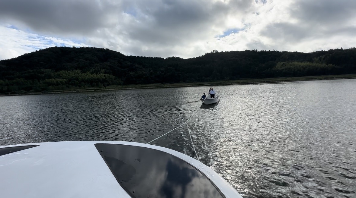 そして、遊覧船では実際にロープをつなぎ救助船での曳航訓練を行いました。