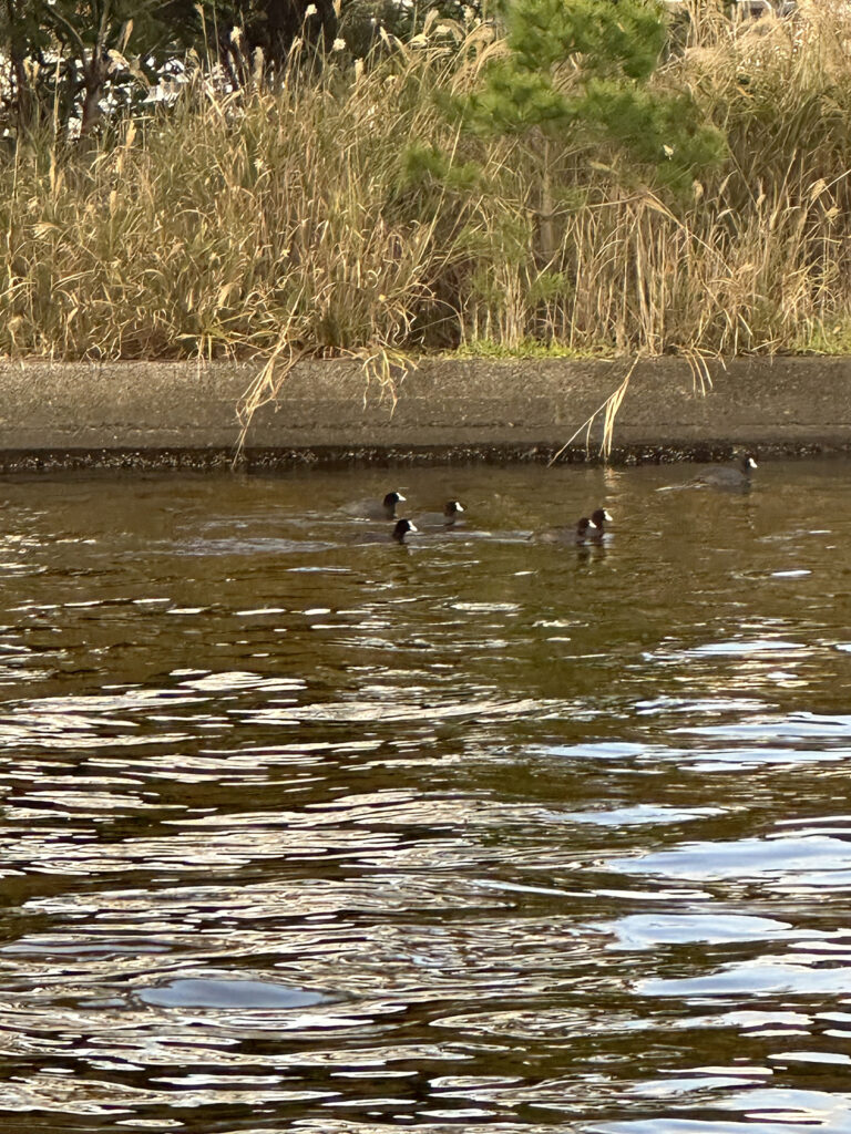 久々子湖には冬の時期たくさんの渡り鳥が来ていて、様々な種類の水鳥たちが船のそばを泳いでいます。