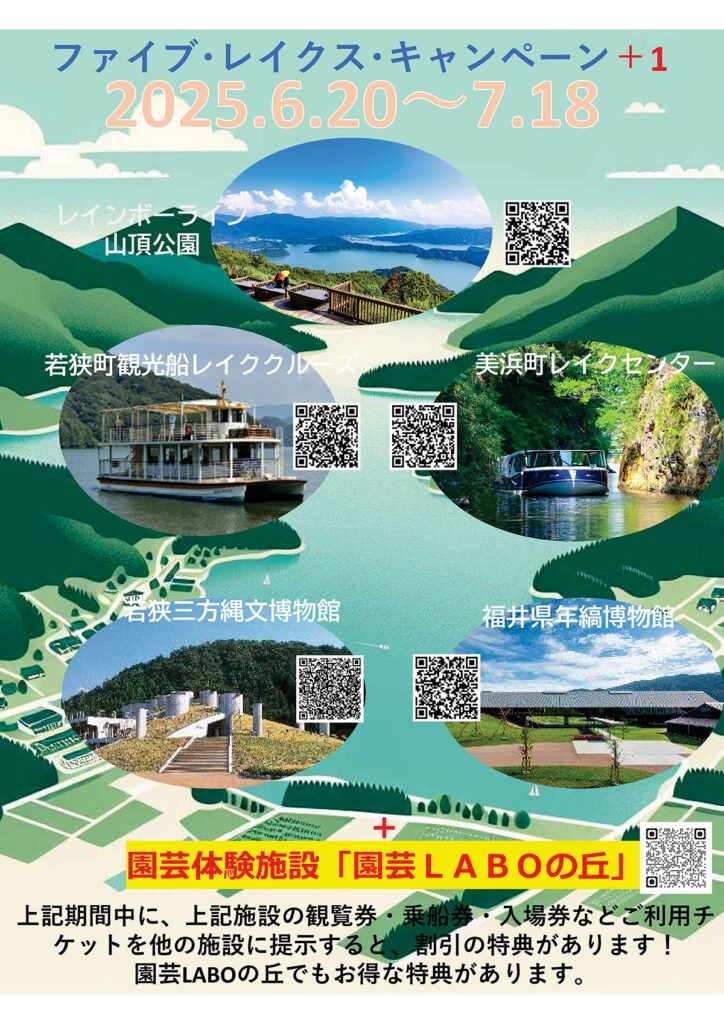三方五湖周辺の5施設+1施設の観覧券、乗船券、入場券などを割り引くキャンペーンを開催します。
