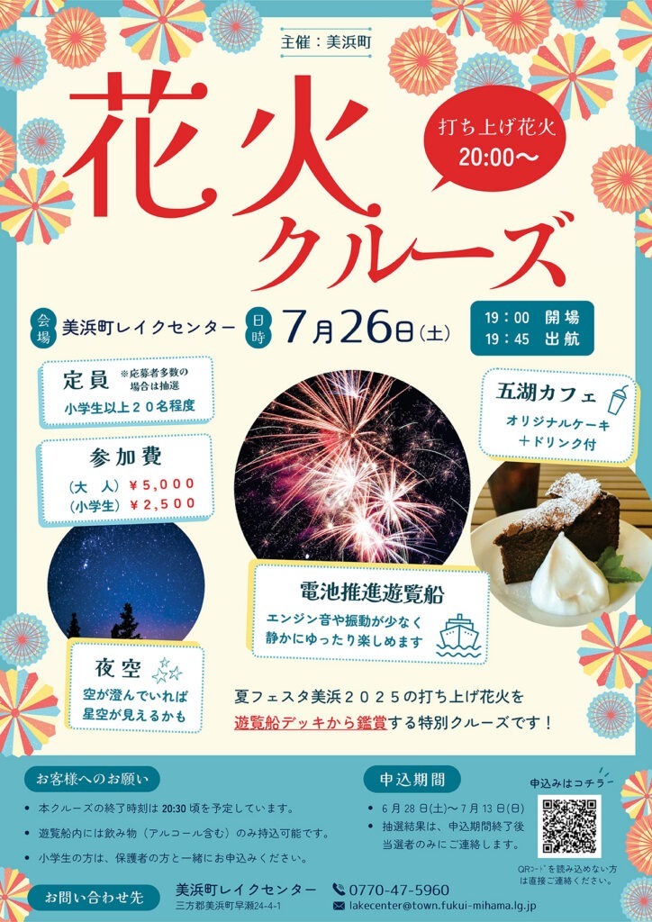 美浜町レイクセンターでは、夏の夜を彩る特別イベント「花火クルーズ」を開催します。