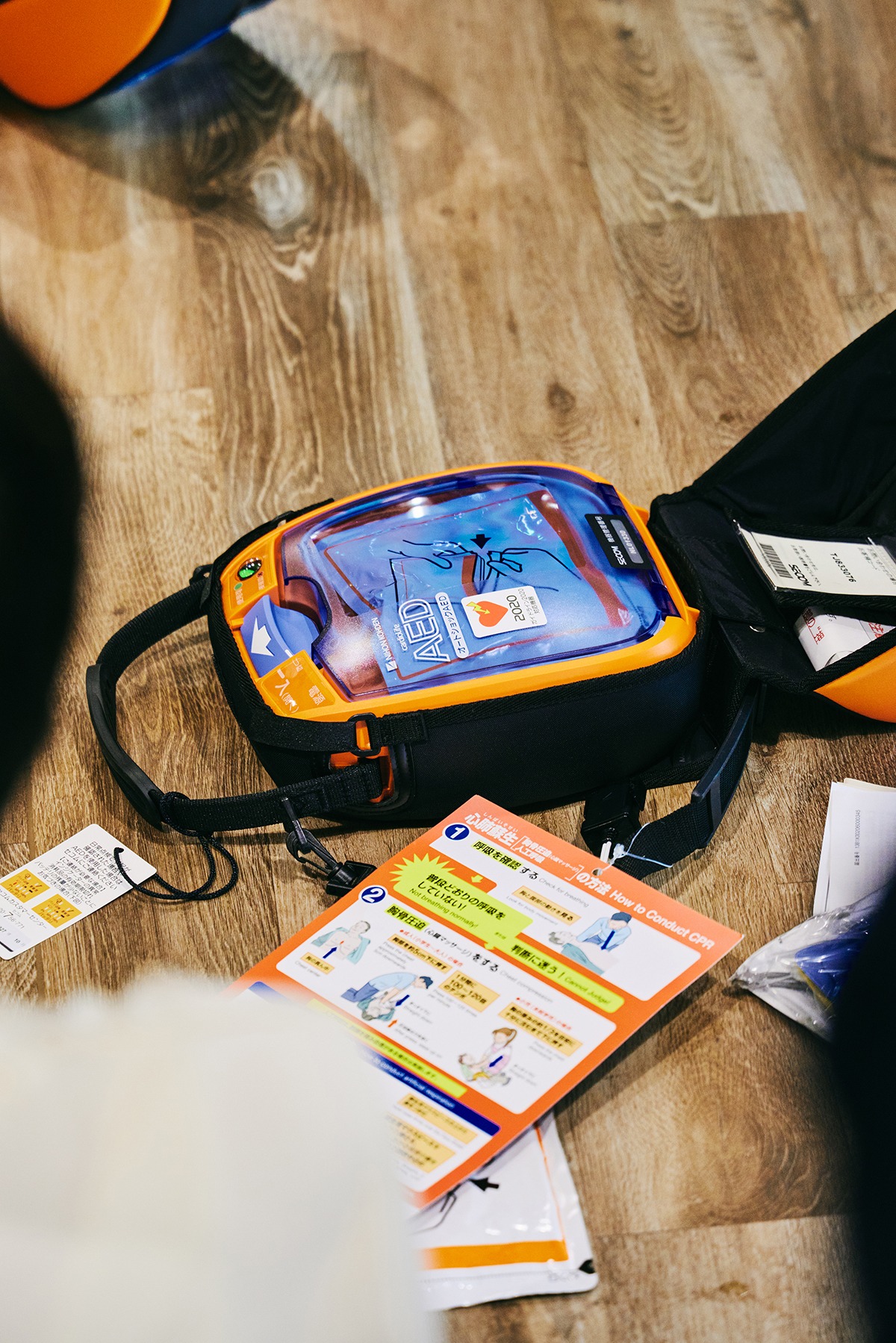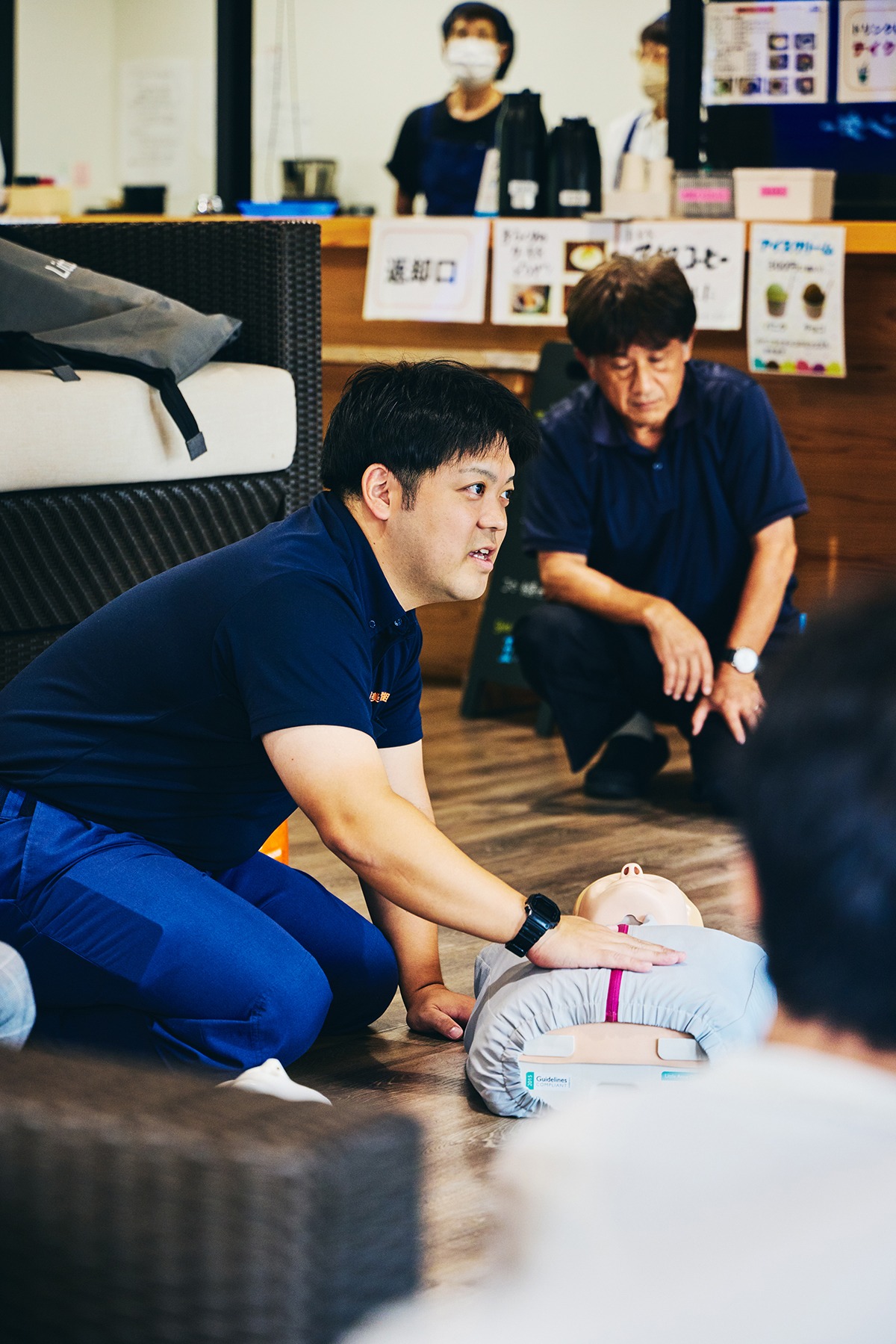 レイクセンター職員と遊覧船ガイドが参加し、AED取扱訓練、遊覧船航行中に乗客の容態急変を想定した、傷病者対応訓練