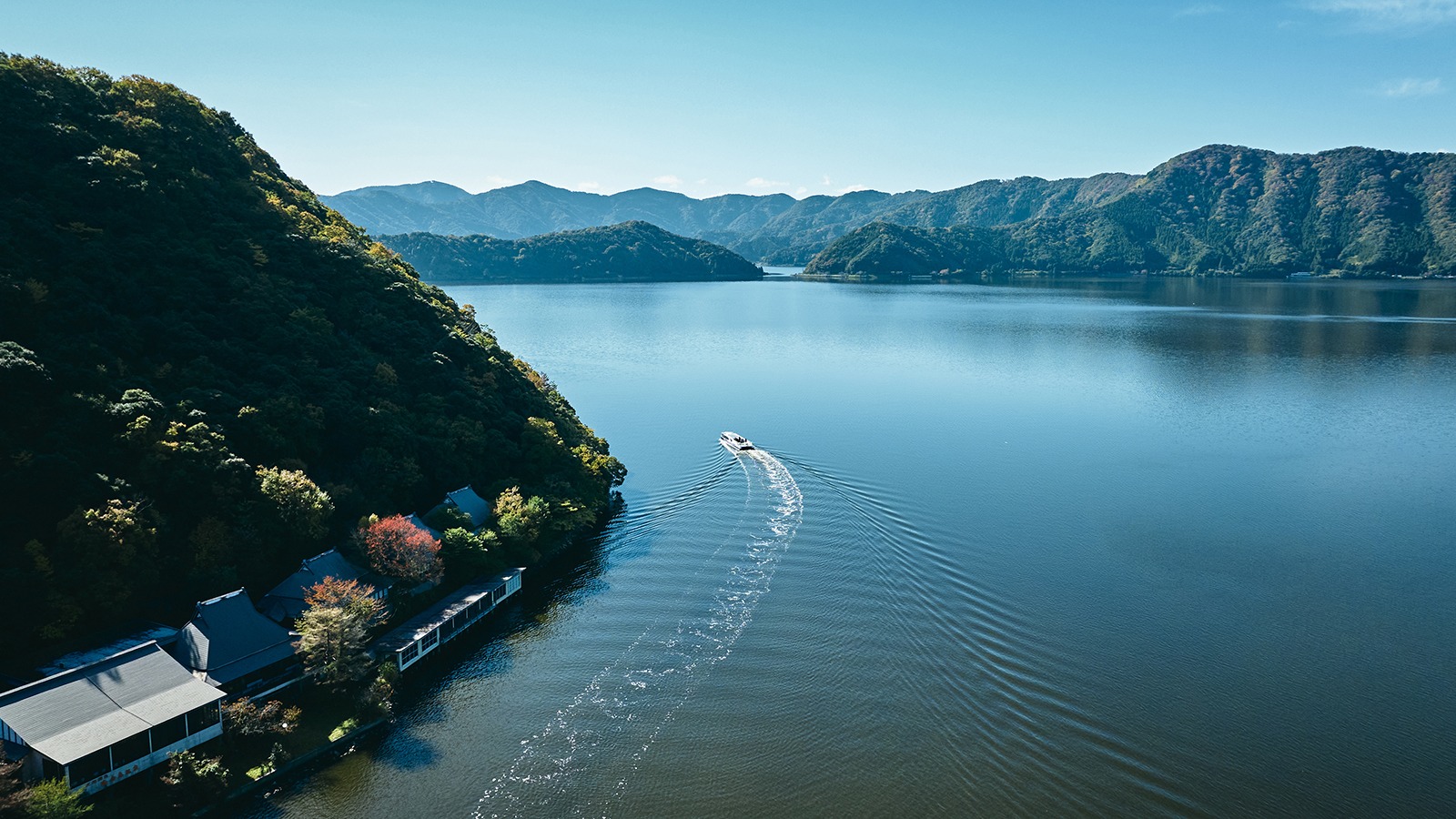 クルーズは、久々子湖を出発し、約360年前に人工掘削された歴史的運河「浦見川」から水月湖・菅湖を巡ります。観覧デッキからは360度の絶景と、水辺に広がる静寂の世界が広がります。冬は、湖面の澄みきった水鏡、山々の稜線、シーズンならではの野鳥が楽しめるなど、一年の中でもとっておきの魅力に出会えます。