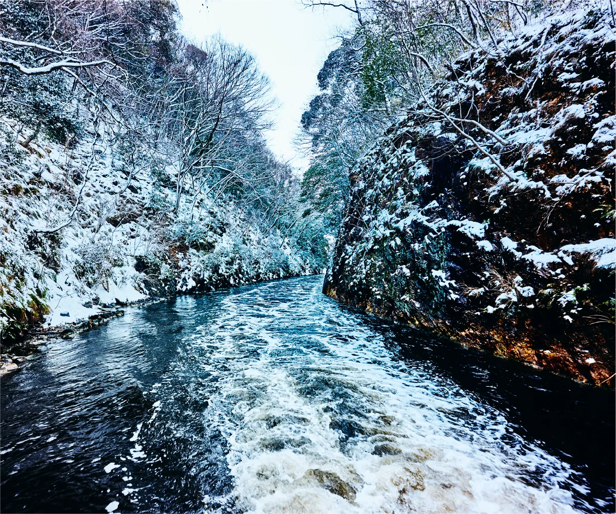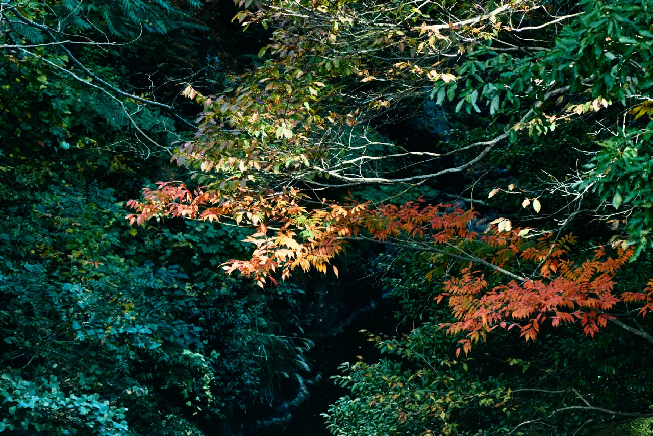 浦見川の両岸に広がる手つかずの原生林が、まるで秘境への入口のような、色鮮やかな緑のトンネルを作り出します。