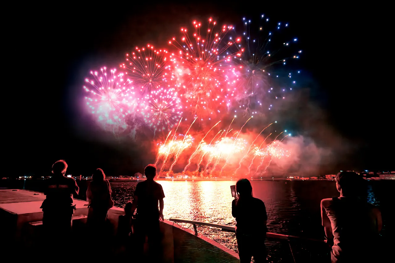 美浜町の夏のイベント「夏フェスタ美浜」のフィナーレを飾る花火を、湖上の特等席から楽しむ限定クルージング。湖面と夜空が光で埋め尽くされる、この日だけの特別な絶景を楽しめます。