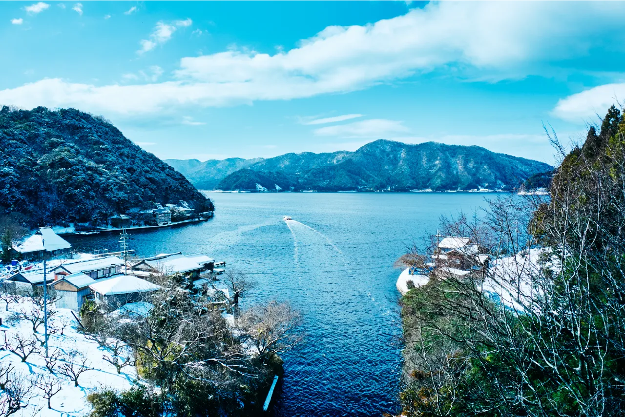 辺り一面が銀世界に変わる、冬の三方五湖。 雪化粧した山々と湖面のコントラストは息を呑む美しさです。